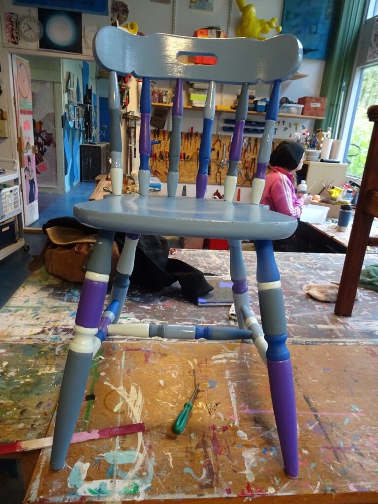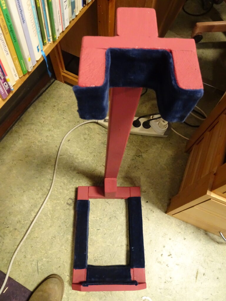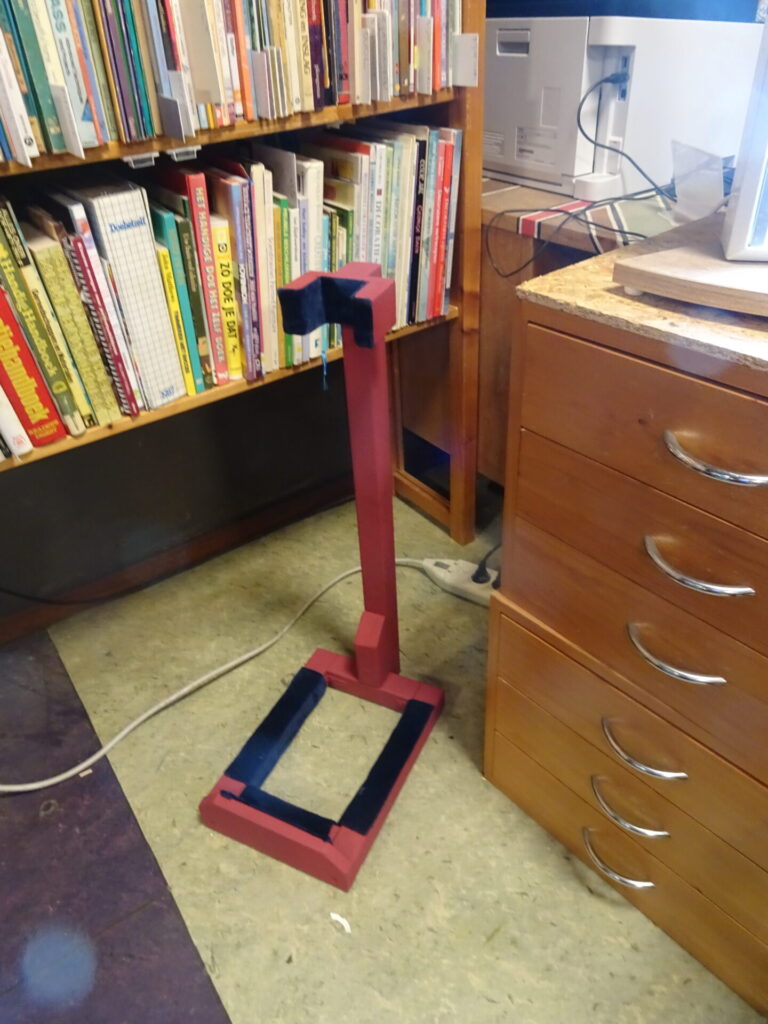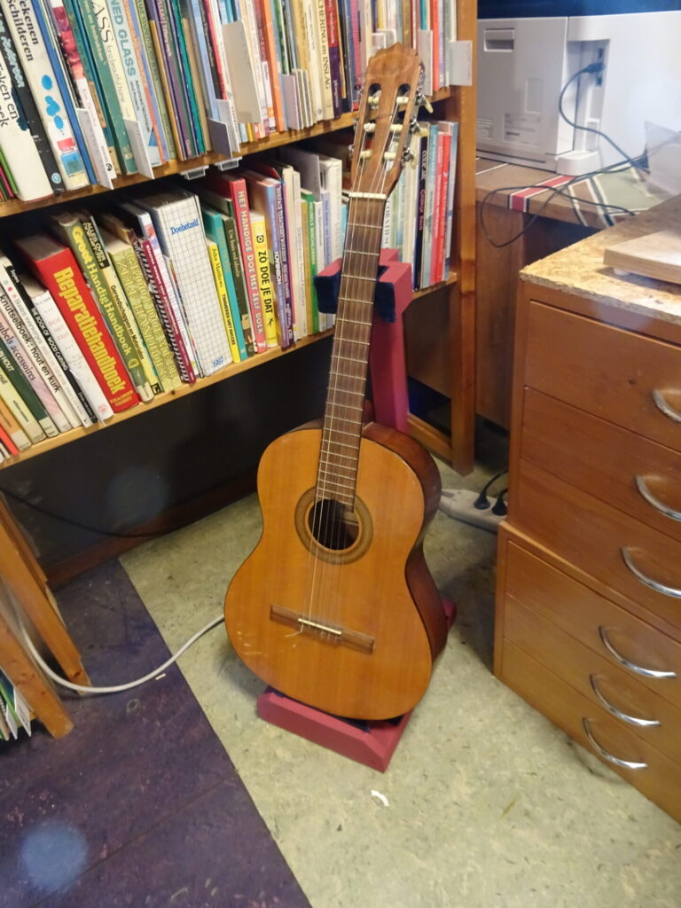 Oscar heeft een gitaarstandaard voor ons gemaakt, zodat de gitaar niet steeds omvalt