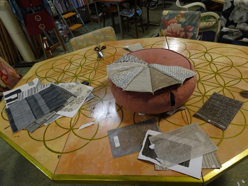 We willen aan de slag met de prachtige meubelstof stalen. Eerste poef is klaar.