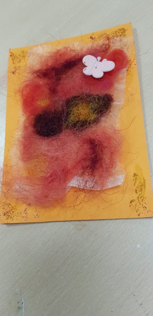 Neem een stukje zijde stof of gaas, prik gekleurde wol erdoor en plak op karton